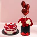 Fantastic Mixed Roses n Three Heart Shape Balloon in Black Box with Red Velvet Cake