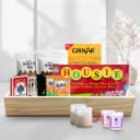Deliver happiness by gifting this Fantastic Xmas Evening Party Hamper to your relatives and friends. This X-mas Hamper is composed of: 1. Girnar Instant Tea Premix with Masala (10 Sachet) 140g 2. Set of 2 Borosil Vision Tea N Coffee Glass Mug (Microwave Safe, Pink Handle) 190 ml 3. 2pc Malkist Crunchy Layer Crackers - Cheese 23g 4. Waffle Mill - Waffle Chips - Milk Choco Drizzle 85g 5. Waffle Mill - Waffle Chips - Dark Choco Drizzle and Sea Salt 85g 6. Playing Cards 7. 2pc Aroma Shots Candles 8. Housie 9. A Wooden Tray.