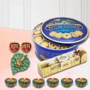 Surprise your near and dear ones on this Diwali by sending this Festive Gift Combo with Best Wishes and make them happy. This Gift Combo contains 4Pcs Ferrero Rocher Chocolates, Royal Dansk Butter Cookies (400Gms), Wax Diyas (6Pcs), a 3 pcs Subh Labh Banderwal Set. (Please note: Subh Labh Banderwal Set image may vary as per product availability)