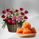 This gift combo includes: - 12 Roses N 4 Pink Lilies Basket Arrangement - Boondi Laddu (250 Gms) This elegant gift combo includes a basket arrangement of 12 roses and 4 pink Asiatic lilies, creating a stunning floral display that exudes beauty and sophistication. The fragrant lilies paired with vibrant roses make this arrangement a perfect centerpiece for any occasion. Alongside the flowers, 250 grams of Boondi Laddu, a popular Indian sweet known for its sweet, crunchy texture, adds a delightful treat to this combo. Whether it’s a celebration or a gesture of appreciation, this combo is sure to make the recipient feel special and cherished.