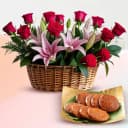 This gift combo includes: - 12 Roses N 4 Pink Lilies Basket Arrangement - Athirasam (250 Gms) This beautiful gift combo features a basket arrangement of 12 roses and 4 pink lilies, paired with 250g of traditional athirasam. The combination of roses and lilies creates a visually stunning arrangement, perfect for bringing joy and brightness to any celebration. The soft, fragrant blooms are accompanied by the crispy and chewy athirasam, a beloved South Indian sweet that adds a festive touch to the combo. This thoughtful pairing is perfect for gifting on festive occasions, expressing both admiration and sweetness.