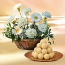 This gift combo includes: - 6 White Carnations N 6 White Gerberas Arrangement - Kheer Kadam (500 Gms) This serene gift combo features an elegant arrangement of 6 white carnations and 6 white gerberas, symbolizing purity, peace, and grace. The combination of these classic white blooms creates a calming and sophisticated display, making it perfect for expressing sympathy, gratitude, or simply adding a touch of tranquility to any space. Complementing the floral arrangement is 500 gms of Kheer Kadam, a delightful Indian sweet made with soft, creamy layers of khoya and sugar, filled with a luscious center of juicy rasgulla. This thoughtful gift blends the elegance of flowers with the indulgent sweetness of Kheer Kadam, offering a peaceful and delicious experience for any occasion.