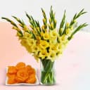 This gift combo includes: - 10 Yellow Gladiolus in a Glass Vase - Mini Jangiri (500 Gms) This bright and uplifting gift combo includes 10 radiant yellow gladiolus arranged in a sleek glass vase and 500g of traditional mini jangiri. The vibrant yellow gladiolus symbolizes strength and positivity, making them the perfect flowers to brighten someone’s day. Their tall, graceful blooms add elegance to any space, while the sweet, syrup-soaked jangiri offers a delicious treat that melts in the mouth. This delightful combination is perfect for celebrations, offering both visual beauty and sweet indulgence for your loved ones.