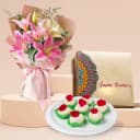 This gift combo includes: - 6 Asiatic Lilies Bouquet - Golap Pati Sandesh (10 Pcs) Celebrate life’s moments with the sophisticated Fresh Lilies N Golap Pati Sandesh Bites gift combo. The six Asiatic lilies in this arrangement are a true testament to beauty, featuring vivid colors and a fragrance that lifts the spirit. Each flower is a thoughtful way to communicate admiration. To make the gift even sweeter, we include ten pieces of Golap Pati Sandesh, infused with a fragrant rose essence that adds a twist to traditional sweets. Together, they create a harmonious experience that indulges the senses and evokes joy. Whether it’s a birthday, anniversary, or just a gesture of love, this luxurious combo is the perfect choice!