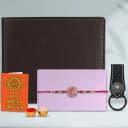 This gift combo contains: - A Ganesha Rakhi by Rakhi Sutra (DFRK1420PB) - Urban Forest Leather Wallet with Keyring N Pen Combo (Brown) - Complimentary Roli Tika N Chawal - Complimentary Message Card with Free Rakhi Looking for the perfect Raksha Bandhan gift? Check out our Ganesha Rakhi N Leather Essentials Combo! Featuring a beautifully designed Ganesha Rakhi that exudes auspiciousness, this set comes with a sophisticated brown leather wallet from Urban Forest. With its accompanying keyring and pen, this wallet is perfect for daily use. To embrace the rituals, we include Roli Tika N Chawal and a personalized message card. It’s a wonderful gift that demonstrates love and care in a practical and stylish way that any brother would adore.
