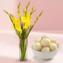 This gift combo includes: - 10 Yellow Gladiolus in a Glass Vase - Rasgulla (10 Pcs) This gift combo brings together the vibrant beauty of 10 yellow gladiolus in a glass vase and the soft, syrupy goodness of 10 pieces of Rasgulla. The yellow gladiolus, symbolizing strength and joy, create a stunning display of elegance and cheerfulness, while the Rasgulla, a beloved traditional sweet, offers a delectable treat. Perfect for celebrations, thank-yous, or simply to brighten someone’s day, this combination of striking flowers and sweet indulgence makes for a thoughtful and heartwarming gift.