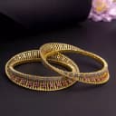 Transform your festive look with these stunning gold-plated bangles. Skillfully designed with intricate cutouts and adorned with sparkling stones and rich ruby accents, they represent a perfect fusion of classic craftsmanship and contemporary style. Ideal for joyous occasions, weddings, or as a thoughtful present.