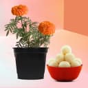 Brighten someone's day with our vibrant Marigold Plant paired with a delectable treat of rasgullas. The stunning golden blooms of the marigold are perfect for enriching any outdoor scenery, while the 500g of freshly made rasgullas provide a delightful sweetness. This perfect pairing serves as a wonderful gift to celebrate those cherished occasions. Let the beauty of flowers and the sweetness of treats convey your heartfelt emotions.