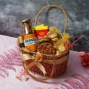 This gift basket contains: - 2 Chocolate Bars (Oreo and fruit and nut) - 6 pcs Almond Florentines - Chocolate Coated Raisins (150 gms) - 2 Pcs Chocolate Assorted Logs - 6 Chocolate Almond Rocks - A Granola Bottle (150gms) - Comes in a Basket Delight your senses with our Gourmet Chocolate Delight Basket, a treasure trove of indulgence. Unwrap the magic of two sumptuous chocolate bars in Oreo and fruit and nut flavors, perfectly paired with six decadent almond florentines for a taste of luxury. Immerse yourself in the sweet joy of 150g of chocolate-coated raisins and experience the richness of two chocolate assorted logs. Indulge in the delightful crunch of six chocolate almond rocks and complement your journey with a 150g bottle of wholesome granola. Beautifully presented in a charming basket, this collection is a thoughtful and tasteful gift for any occasion. Treat yourself or share the joy with a loved one, creating moments of pure delight with this diverse and delicious ensemble.