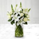 This arrangement is made of: - 25 White Rajnigandha, White Lily n White Roses - A Glass Vase Let others feel your presence with this Graceful White Flowers in Glass Vase to express your Condolence to the grieving family. This Glass Vase is elegantly arranged with 25 White Flowers like White Rajnigandha, White Lily n White Roses.