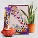 The Diwali Hamper consists of: - Diya - Snake Plant with Pot 2 pcs - 5 Star 3D Chocolate Bar 42g each - A Free Message Card Celebrate the Festival of Lights in style with our enchanting Green And Chocolate Delights Hamper. This thoughtfully curated gift set captures the essence of Diwali, offering a harmonious blend of tradition and modernity. As you unpack the hamper, youll discover delightful surprises that will fill your heart with joy. The centerpiece of this hamper is the exquisite Diya, a symbol of light and warmth that will illuminate your home with its gentle flicker. Alongside the Diya, youll find two Snake Plants nestled in elegant pots, bringing natures tranquility and positive vibes to your living space. Indulge your sweet tooth with the mouthwatering 5 Star 3D Chocolate Bars. Each bite is a heavenly combination of smooth milk chocolate and crunchy caramel, creating a divine treat that will leave you craving more. To add a personal touch to your gift, weve included a free message card. Use it to convey heartfelt wishes and blessings to your loved ones, making this Diwali a memorable one. Embrace the spirit of Diwali and spread happiness with our Diwali Hamper. Perfect for gifting or treating yourself, this hamper is a celebration of festivities, love, and togetherness.