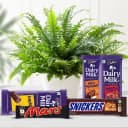 Experience tranquility with our Green Serenity and Chocolate Bliss Set, featuring the elegant Bostern Fern nestled in a durable plastic pot. This impressive air-purifying plant stands 3 to 7 inches tall, ideal for brightening up any indoor space. Paired with an exquisite selection of mouthwatering chocolates including Mars, Snickers, and a variety of Cadbury treats, this combo is the perfect surprise for anyone who appreciates nature's beauty and sweet indulgence.