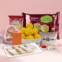 This Gift Combo features: - 250 gm Haldiram Soan Papdi (Gross Weight) - 250 gm Haldiram Kaju Katli (Gross Weight) - 250 gm Haldirams Bhujia (Gross Weight) - 250gm Boondi Ladoo (Gross Weight) - 3 pcs Homemade Chocolates in a Heart Shaped Box - Rakhi - Roli Tilak & Chawal. Fetch profuse elation to your endeared ones by sending them this Haldirams Appetizing Gift Combo and color their hearts with sugary fervor.