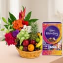 This gift combo has: - 10 Mixed Flowers Bouquet - Mixed Fruits Basket (2Kg) - Cadbury Celebrations Pack (110 gms) Create a beautiful world for your loved ones by sending this Healthy 2 kg Mixed Fruits Basket with Cadbury Celebrations Pack (110 gms) and 10 Mixed Flowers Bouquet to show the essence of your love and warm feelings.