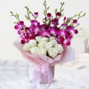 This bouquet is made of: - 10 Orchids - 10 White Roses Make the celebration more outstanding by gifting this impressive Bouquet of 10 Orchids N 10 White Roses, wrapped by a tissue that instantly rejuvenates the mood of everyone present.