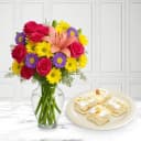 Bring joy to someone's day with this delightful combination of our luxurious Malai Sandwiches from Brijwasi Sweets and a stunning bouquet of 24 mixed flowers. This perfect pair is designed to create unforgettable moments, making it ideal for any occasion, whether it’s a celebration or simply to express your affection. Available exclusively in Mumbai, this enchanting gift speaks volumes of your love!