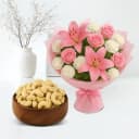 Shop Kaju King (250 g) from Shree Mithai with 8 Flowers Bouquet (Pink Lily, White Carnations N Pink Roses) to wish your loved ones on their special days. (Only Available at Chennai)
