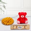 Elevate your celebrations with the delightful pairing of Mohanlals Mithaiwala Kesar Mewa Peda and a charming 6-inch teddy bear. This exquisite ensemble features 250 grams of mouth-watering Kesar Mewa Peda and four delectable Ferrero Rocher chocolates to satisfy your sweet cravings. Ideal for festive occasions or intimate gatherings, this duo spreads joy and sweetness, capturing the essence of shared moments. Exclusively available in Ahmedabad, treat yourself or surprise a loved one with this enchanting blend of tradition and fun!