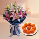 This gift combo includes: - 6 Asiatic Lilies Bouquet - Sahi Laddu (400g) Indulge in the luxurious combination of 6 Asiatic lilies in a bouquet paired with 400 grams of Sahi Laddu. The Asiatic lilies, known for their bold and beautiful blooms, create a stunning bouquet that exudes elegance and sophistication. These flowers are perfect for celebrating milestones, birthdays, or any occasion that calls for a touch of class. Paired with the bouquet is Sahi Laddu, a rich and decadent sweet made with premium ingredients, offering a royal taste experience that is both satisfying and memorable. This gift combo is a wonderful way to express admiration, celebrate success, or simply treat someone special to a moment of indulgence.