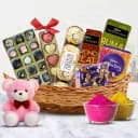 Surprise your special ones by sending this Lip-Smacking Chocos Gift Basket for Holi and spread love and happiness around. This item comprises of: 1. 5 pcs Heart Shape Homemade Assorted Chocolates 2. Sweet Teddy (6 inch) 3. 4 pcs Ferrero Rocher Chocolates 4. 2 pcs Temptation 5. Cadbury Small Celebration 6. 18 pcs Homemade Assorted Chocolates 7. Cadbury Eclairs (Small Packet) 8. Free Vibrant Herbal Gulal (2 pkts) 9. All items are kept in a Small Cane Basket