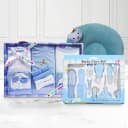 Deliver happiness by sending this Lovely Blue Dress Set with Grooming Kit N Neck Supporting Pillow Combo to your dear ones. This Combo comprises of: 1. a. Item: 13 pc Dress Set b. Age Group: Ideal for 0-3 Months c. Color: Blue d. Fabric: Cotton 2. a. Item: 10 Pc Grooming Kit b. Age Group: 0 Months and Up c. Color: Blue d. Item Dimensions: 29.2 x 20.1 x 4.3 cm 3. a. Item: Soft Neck Supporting Baby Pillow b. Color: Sea-Green c. Fill Material: Mustard Seeds d. Material: Velvet Note:- Country of Origin: India