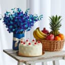 Order online these Lovely Blue Orchids in Vase with Mixed Fruits, Butterscotch Cake N Sparkling Juice. This flowers gift combo includes: Details: No. of Flowers: 12 Type of Flowers: Orchids Flower Color: Blue Type of Arrangement: In Vase Type of Cake: Butterscotch cake Shape of Cake: Round Weight: 1/2kg Content of Fruits Basket: 1kg Pears, 500g Orange, 500g Pomegranate, 1pc Pineapple, 1kg Banana Type of Basket: Cane Basket with Handle Type of Juice: Fruit Juice (Non Alcoholic) Volume: 750ml.