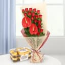 This gift combo has: - Red Roses n Anthurium Bouquet - 16 pc Ferrero Rocher Box Make occasions grander with this Lovely Bouquet of Red Roses n Anthurium wrapped with tissue along with a Box of 16 pc Ferrero Rocher and share the moment with your loved ones.