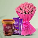 This gift combo has: - 36 Pink Roses Tissue Wrapped Bouquet - Kwality Walls Choc-n-Roll Choco Brownie Fudge Ice Cream Tub (700ml) - 2pc Cadbury Dairy Milk Silk Chocolate Bar (60g each) Send this exclusive gift of Lovely 36 Pink Roses tissue wrapped Bouquet with Kwality Walls Choc-n-Roll Choco Brownie Fudge Ice Cream Tub (700ml) and 2pc Cadbury Dairy Milk Silk Chocolate Bar (60g each) to your dear one and express your love and affection.