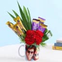 Love will be best expressed on Valentines Day by sending this gift of Lovers Choice Personalized Photo Mug Full of Carnations n Cadbury Chocolates which will aid in creating a long lasting impression upon your sweetheart. This Personalized Photo Mug is beautifully presented with 4 Red Carnations, 3pc Cadbury Dairy Milk Chocolate Bar (13g each) and 3pc Cadbury Five Star Chocolate Bar (10g each). Details needed: Send a digital photo with your Alpha-numeric order id at: designphotocake@gmail.com or Whatsapp at +91 9230721098.
