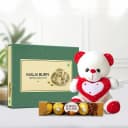Shop Malai Barfi (500 gm) with a 6in Teddy N 4pcs Ferrero Rocher Chocolate Pack to wish your loved ones on their special days. (Only Available at Delhi)