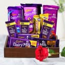 Create a beautiful world for your loved ones by sending this Marvelous Chocolate Gift Basket wrapped up in the essence of your love and warm feelings. This Basket features: 1. Cadbury Silk Bubbly (50 g) 2. Cadbury Silk Oreo (60 g) 3. Cadbury Silk Red Velvet (60 g) 4. Cadbury Dairy Milk Fruit n Nut (36 g) 5. Cadbury Dairy Milk Roast Almond (36 g) 6. Cadbury Dairy Milk Crackle (36 g) 7. Cadbury Dairy Milk Bar (13 g x 3 pc) 8. Cadbury Five Star (10 g x 2 pc) 9. 1 Black Wooden Tray 10. with Single Red Rose