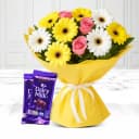 This gift combo has: - 12 Mixed Flowers Bouquet - 2 Pc Cadbury Dairy Milk (13 Gms each) Keep up the spirit of Marriage Anniversary celebration with this Styled 12 Mixed Flowers Bouquet with 2 Pc Cadbury Dairy Milk (13 Gms each) that has the quality of instantly uplifting the mood of all.