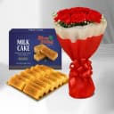 Shop Online for Milk Cake (250 Gms) from Shree Mithai with 12 pcs Red Carnation Tissue Wrapped Bouquet N send it to your family N friends. (Only Available at Chennai)