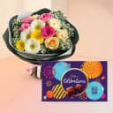 This gift combo has: - 10 Mixed Flowers Bouquet - Cadbury Celebrations Pack (126 gms) Make a celebration more outstanding by adding to it this Birthday Combo of 10 Mixed Flowers Bouquet and Cadbury Celebrations Pack (126 gms) that instantly rejuvenates the mood of everyone present.