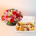 This gift combo includes: - 12 Roses Basket N 4 Pink Lilies Arrangement - Assortd Sweets (500g) Express elegance and sweetness with this enchanting gift combo, featuring a basket arrangement of 12 radiant roses paired with 4 delicate pink lilies, accompanied by 500 grams of assorted sweets. The roses, a classic symbol of love and admiration, blend beautifully with the pink lilies, known for their grace and charm. This stunning floral arrangement is perfect for celebrating love, friendship, or simply showing appreciation. Complementing the floral beauty is a selection of assorted sweets, offering a variety of traditional flavors that cater to every palate. This thoughtful combo is ideal for special occasions such as anniversaries, birthdays, or as a delightful surprise for someone who appreciates both beauty and sweetness.