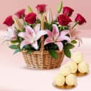 This gift combo includes: - 12 Roses N Pink Lilies Basket Arrangement - Kheer Kadam (10 Pcs) This elegant gift combo includes a stunning basket arrangement of 12 roses and pink lilies, accompanied by 10 pieces of delicious Kheer Kadam. The roses, symbolizing admiration and love, blend beautifully with the soft pink lilies, known for their grace and charm. Arranged in a stylish basket, the flowers create a captivating display that’s perfect for any celebration or special occasion. Paired with this floral masterpiece is the beloved Kheer Kadam, a Bengali delicacy made from creamy kheer encasing a sweet chhena core. Each bite is a delightful mix of flavors and textures, making this combo a wonderful way to express appreciation, love, or joy in both a visual and culinary treat.