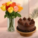 This gift combo has: - 12 Mixed Roses - A Glass Vase - Chocolate Cake (500g) Deliver happiness with this Combo of Fresh 12 Mixed Roses arranged in a Glass Vase with 1/2 Kg Chocolate Cake arranged ideally to make your loved ones very contented and joyous.