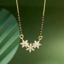 The Nimoraa Celestial Charm Mangalsutra features a lustrous gold-plated chain embellished with exquisite black beads and artfully crafted celestial motifs. Drawing inspiration from the enchanting cosmos, it showcases dazzling marquise-cut stones that create stunning star patterns, offering an elegant touch with a lightweight feel. The high-polished finish provides a brilliant shine, making it suitable for everyday wear and special events. This unique piece blends modern aesthetics with traditional design, serving as a perfect complement to both western attire and traditional outfits. An ideal choice for celebrations, gifts, and personal milestones, it embodies the essence of grace for the modern woman.
