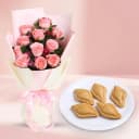 Send Nolen Gurer Shankh Sandesh (400g) from Ganguram with 10 Pink Rose Bouquet to your near ones. (Only Available at Kolkata)