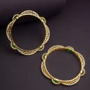 Embrace elegance with these opulent gold plated bangles adorned with intricate lattice work and captivating green gems. Perfect for elevating any outfit, these bangles are a must-have for every jewelry collection.