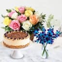 Immerse yourself in a world of elegance with this exquisite blend of floral charm and delightful sweetness. The stunning Blue Orchids arranged in a chic vase create a captivating centerpiece, while an assortment of pink, peach, white, and yellow roses encircle them in a charming round basket. Complementing this visual feast is a rich butterscotch cake, perfect for satisfying your sweet tooth. This delightful combo is an ideal choice for celebrating special moments or simply putting a smile on a loved one's face.