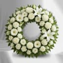 Gift this Peaceful White Funeral Wreath and show your honor and respect to someone who is not within us. This wreath is made of 70 white flowers including: a. Roses b. Carnations c. Daisies d. Lilies