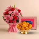 Immerse yourself in a charming experience with our Petals & Sweets gift set. This delightful pairing features 4 radiant red roses and 4 soft pink roses, along with the joyful spirit of 5 pink carnations and 3 graceful pink lilies. Each flower symbolizes love and affection, making it an ideal gift for your loved ones. To complement this stunning floral arrangement, we present the traditional Motichur Laddu, a 250-gram treat made from delicate gram flour pearls, infused with cardamom and a touch of nuts for added crunch. Perfect for birthdays, festive moments, or just to show you care, this exquisite combination of beauty and taste makes a perfect gift.