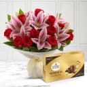 This gift combo has: - 3 Stem Lilies (3*3 buds/flowers) N 12 Roses Bouquet - 16 Pcs Ferrero Rocher Moment Chocolate Box This Precious Bouquet comprising of 3 Stem Lilies (3*3 buds/flowers) N 12 Roses nicely tied with tissue with 16 Pcs Ferrero Rocher Moment Chocolate Box is sure to make the day of your dearest ones extra special and memorable when you deliver this item on their doorstep.