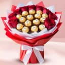 This bouquet is made of: - 16 pcs Ferrero Rocher Chocolate - 16 pcs Red Roses Pamper your loved ones by sending them this Premium Bouquet of Ferrero Rocher Chocolate with Red Roses (16 pcs each) wrapped by a tissue exclusively meant to convey your wishes in the best manner on their Anniversary.