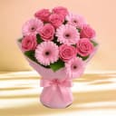Celebrate your special moments with the Radiant Blush Blooms Bouquet, a stunning assembly of 10 enchanting pink roses paired with 10 charming pink gerberas. This hand-crafted bouquet radiates happiness and warmth, making it the perfect gift for loved ones. The accompanying lush green leaves and fillers enhance the visual appeal, ensuring it stands out on any occasion. Bring joy and create cherished memories with this delightful floral arrangement.