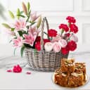 Step into a world of color and flavor with this exquisite gift set. Featuring a breathtaking arrangement of pink Asiatic lilies, vibrant red carnations, and delicate pink roses, this bouquet captivates the senses. With 20 stunning flowers meticulously arranged, it radiates joy and elegance. Complementing this floral masterpiece is a hefty 500 grams of delightful doodha barfi, offering a rich, creamy sweetness that delights the palate. Ideal for celebrating milestones or simply to express your affection, this ensemble is sure to leave a lasting impression. (Only available at Bangalore)