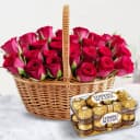 Express your deepest sentiments with this exquisite gift set featuring a stunning arrangement of 30 vibrant red roses. Symbolizing love and devotion, these blossoms are complemented by 16 luxurious Ferrero Rocher chocolates, each elegantly wrapped in gold. This gorgeous basket, equipped with a lovely handle for convenience, is perfect for celebrating special milestones or simply brightening someone’s day.