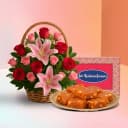 This beautifully arranged gift embodies tranquility and sweetness, perfect for any occasion. Imagine a charming basket with twelve vibrant roses and four stunning pink lilies, each bloom serving as a testament to love and beauty. Coupled with this gorgeous floral display is 250 grams of exquisite Bombay Halwa, renowned for its indulgent taste and melt-in-your-mouth texture. Ideal for commemorating special events, expressing appreciation, or simply bringing a smile to someone’s face, this gift offers joy in every detail.