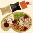 This gift combo includes: - Set of 2 Auspicious Rakhi - Cashews, Raisins, Almonds, Pistachios (500 Gross Wt.) - 5 pc Sapphire Hazellfill Chocolate - Free Roli Chawal Card - A Decorative Pearl Chopra Shaped Tray for Dry Fruits n Chocolates Celebrate Raksha Bandhan by sending your warm wishes with this thoughtful gift combo that includes a Set of 2 Auspicious Rakhi, an assortment of Cashews, Raisins, Almonds, and Pistachios (500g gross weight), and 5 pieces of rich Sapphire Hazellfill Chocolate. The combo is beautifully presented in a decorative pearl Chopra-shaped tray that adds a charming touch to the gift. Also included is a Free Roli Chawal Card to complete the traditional rituals and make the moment memorable for your sibling.